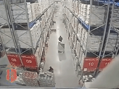 Nhờ phản ứng thông minh, nhanh lẹ, nhân viên coi kho kịp thời chui xuống kệ hàng bên cạnh để tránh kệ hàng chứa hàng ngàn chai vodka đổ sập xuống đầu.