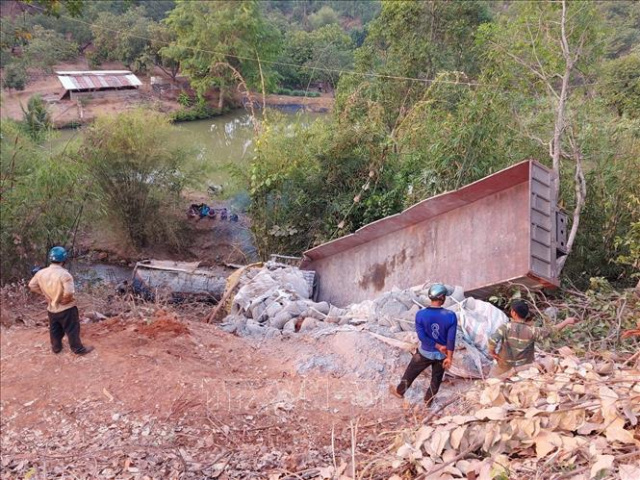 Chiếc xe tải chở hàng chục tấn xi măng gặp nạn lao xuống vực khiến 3 người trên xe bị thương, phải nhập viện.
