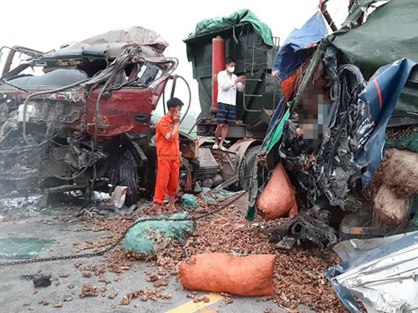 Sau cú tông trực diện, xe đầu kéo và xe tải biến dạng hoàn toàn. Sau vụ tai nạn, 2 người ngồi trên xe tải tử vong.