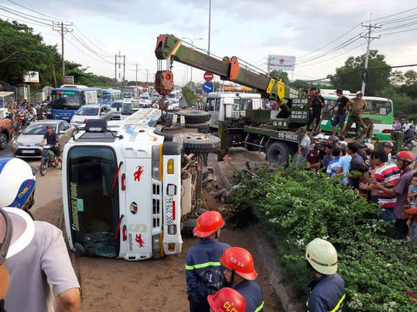 TP.HCM: Xe ben cuốn 2 xe máy vào gầm rồi lật ngang khiến 1 người chết, 2 người bị thương