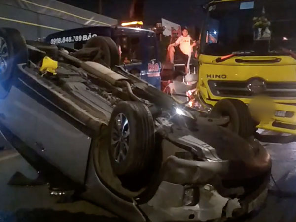 TP.HCM: Ô tô 7 chỗ bị xe tải đâm lật ngửa và văng nhiều mét, một em bé bị thương