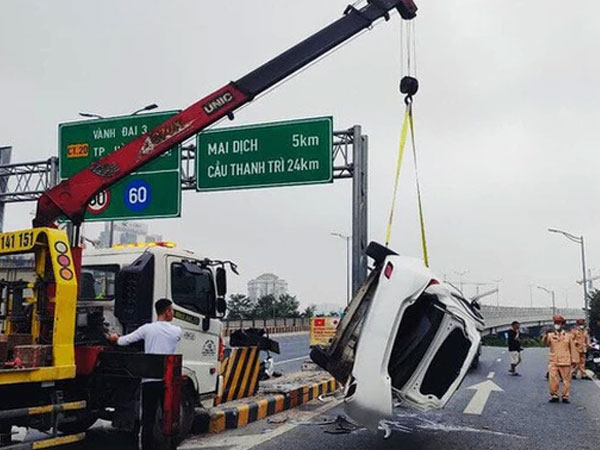 Tài xế ô tô buồn ngủ, tông hai xe máy rồi lật ngửa ở đường Vành đai 3 trên cao