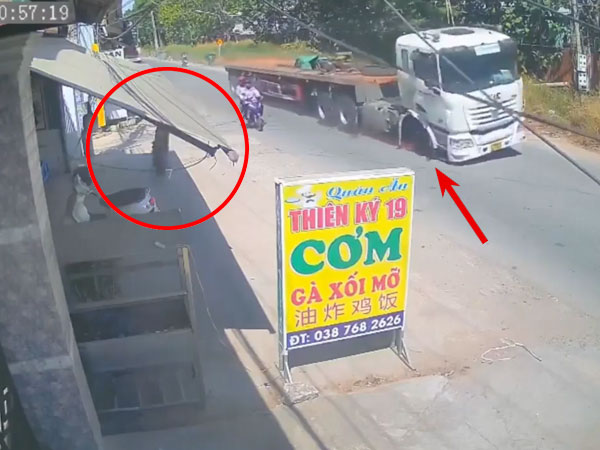 'Hết hồn' với chiếc bánh xe rơi ra khỏi chiếc container suýt va vào hai người đi xe máy