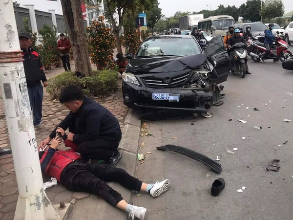 Chiếc ô tô biển xanh bị vỡ nát phần đầu sau cú va chạm mạnh với một xe máy. Sự việc xảy ra tại đường Cổ Linh (đoạn qua phường Long Biên, quận Long Biên, Hà Nội).