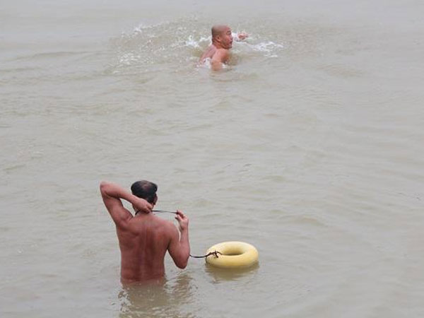Dù nhiệt độ ở Hà Nội xuống khoảng 10 độ C, nhưng nhiều người vẫn hiên ngang cởi trần ra sông Hồng bơi lội như đang ở giữa mùa hè, trong đó có cả những người đã lớn tuổi.