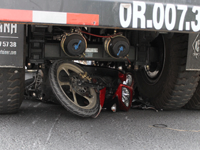 Sau va chạm, hai vợ chồng đi xe máy ngã xuống đường, vợ trọng thương dẫn đến tử vong, còn xe máy lọt vào gầm xe đầu kéo, hư hỏng.