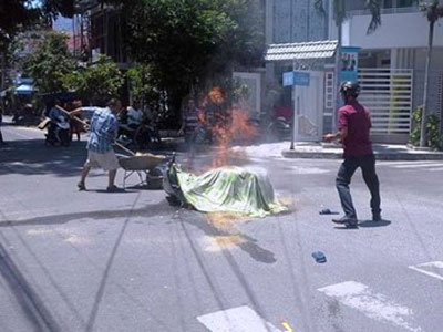 Trưa 27/8 xảy ra vụ tai nạn xe máy hy hữu, làm chiếc xe Atila bốc cháy giữa ngã tư đường. Nhiều người dân đã xông ra dập lửa như... diễn tập chữa cháy.