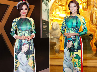 Cả hai người đẹp đều cùng xuất hiện trong bộ áo dài in tranh của họa sĩ Lê Phổ, do NTK Thủy Nguyễn sáng tạo.