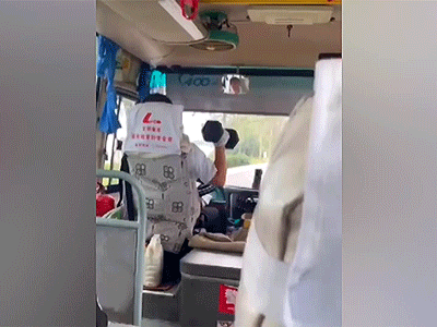 Đoạn video cho thấy người lái xe chỉ dùng một tay để điều khiển vô lăng, tay còn lại liên tục nâng tạ khiến nhiều vị hành khách "toát mồ hôi hột".