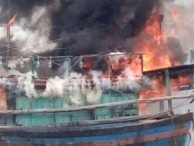 Trang 1Tàu cá bốc cháy dữ dội, 8 thuyền viên vội nhảy xuống biển thoát thân