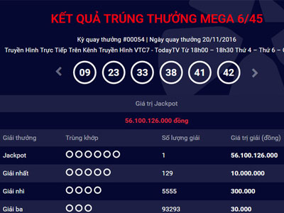 Chiều tối ngày 20/11, hệ thống của Vietlott đã thông báo có một người trúng số độc đắc Mega 6/45 (giải Jackpot) trị giá 56,1 tỷ đồng. Chuỗi số thắng giải là 09-23-33-38-41-42.