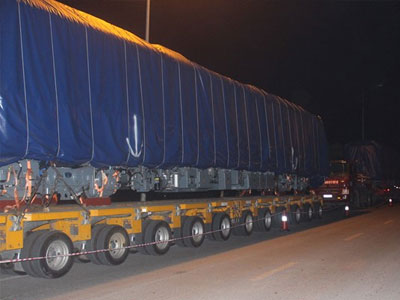 3h sáng 21/2, đầu máy nặng 35 tấn, dài 19 m, cao 3,8 m, ngang 2,8 m được đưa lên đường ray đầu tiên trong số hai đoàn tàu của tuyến đường sắt trên cao Cát Linh-Hà Đông.