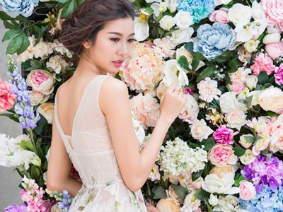 Á hậu Quốc tế thực hiện bộ ảnh ngọt ngào trong những thiết kế lưới to, họa tiết hoa hồng.
