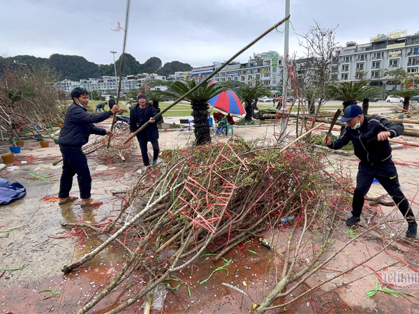 Tại chợ hoa Tết TP Hạ Long (Quảng Ninh) vào sáng 29 Tết Nguyên đán Nhâm Dần, nhiều tiểu thương buôn cây cảnh đã dọn hàng, đào bán ế vứt chất đống, số khác bán rẻ để vớt vát ít tiền.