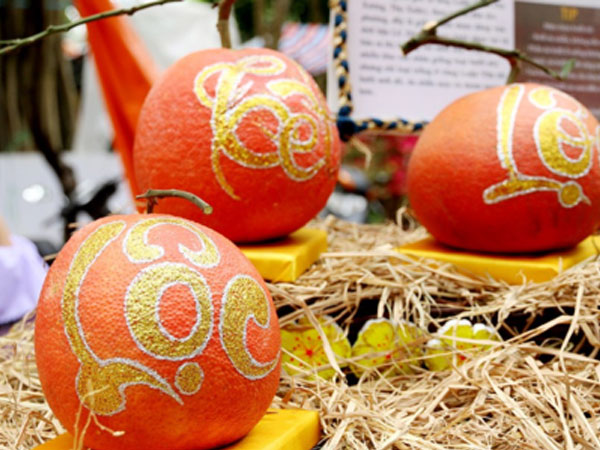 Bưởi đỏ tiến vua vẽ thư pháp giá cả triệu đồng