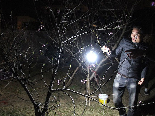 Mặc cho cái lạnh của đêm đông ngày cuối năm, những người bán đào, hoa, cây cảnh Tết vẫn thay nhau túc trực để canh giữ tài sản của mình.