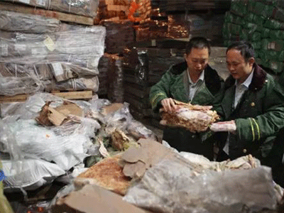 Cảnh sát quận Hà Khẩu, tỉnh Vân Nam, Trung Quốc tiến hành tiêu hủy 670 tấn thịt đông lạnh nhập lậu, gồm những tảng thịt được sản xuất từ 40 năm trước đang tan băng.