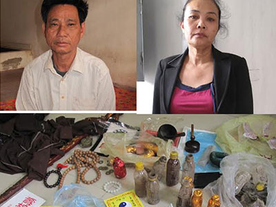 Khi hai đối tượng đang lên đồng, phát thuốc chữa bệnh và thu tiền của khổ chủ thì bị lực lượng chức năng bắt giữ.