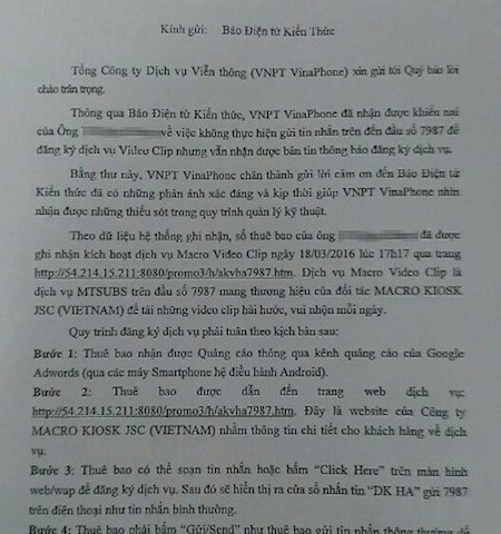 Nhà mạng Vinaphone thừa nhận chủ thuê bao 0948xxxxxx, ông V.N.H. không thực hiện nhắn tin đăng ký dịch vụ Video Clip và bị trừ tiền hàng ngày.