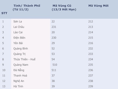 Đổi mã vùng điện thoại cố định từ 11/2/2017
