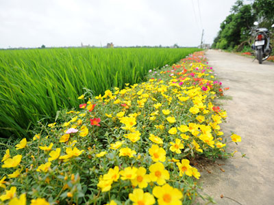 Những con đường bê tông trở nên lãng mạn với các luống hoa đủ sắc màu bên ruộng lúa xanh mướt.