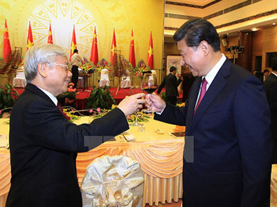 Tối 5/11, Tổng Bí thư Nguyễn Phú Trọng và Chủ tịch nước Trương Tấn Sang tổ chức chiêu đãi trọng thể Tổng Bí thư, Chủ tịch nước Trung Quốc Tập Cận Bình và Phu nhân sang thăm Việt Nam.