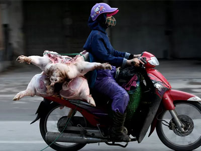 Sáng sớm, những con đường hướng vào nội đô Hà Nội nườm nượp xe máy vận chuyển thịt lợn đến các khu chợ. Hầu hết số thịt này đều không được bao gói đảm bảo vệ sinh an toàn thực phẩm.