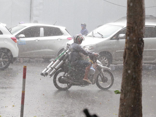 Đúng giờ tan tầm, bầu trời Hà Nội vần vũ mây giông, mưa lớn ập xuống khiến người dân chật vật di chuyển về nhà.