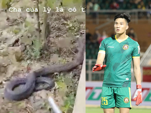 Thủ môn Nguyễn Văn Hoàng dường như rất bình tĩnh khi đối mặt với việc gặp rắn hổ mang ngay trong vườn nhà.