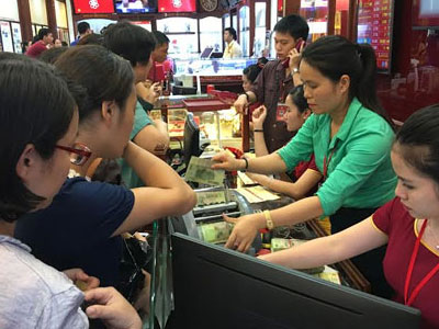 Nhiều cửa hàng vàng tại Hà Nội sáng nay ưu tiên khách mua trước, khách bán giao dịch sau. Những người bán trên 2 lượng vàng không được nhận tiền ngay mà phải cầm giấy hẹn.