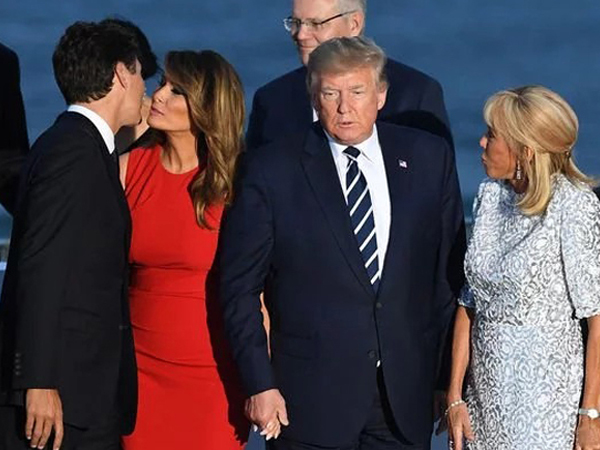 Đệ nhất phu nhân Mỹ hôn gió lên má Thủ tướng Canada Justin Trudeau khi đang đứng cạnh ông Trump trong lúc chuẩn bị chụp ảnh kỷ niệm tại G7.