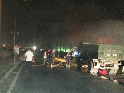 Hiện trường xe tải bốc cháy ngùn ngụt trên cao...