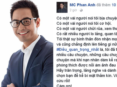Ngoài những tôn vinh vì hành động kêu gọi ủng hộ đồng bào miền Trung bão lũ, MC Phan Anh còn gặp phải những thị phi buồn tủi. Cuối cùng, anh đã lên tiếng thừa nhận.