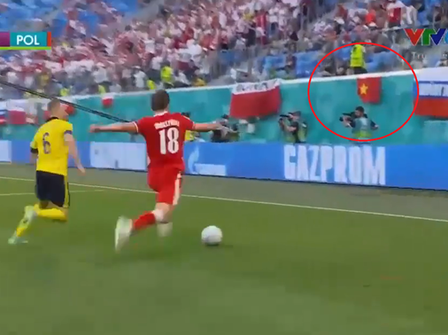 Hình ảnh thú vị đối với người hâm mộ bóng đá Việt Nam khi lá cờ đỏ sao vàng đã xuất hiện trên khán đài VCK EURO 2020.