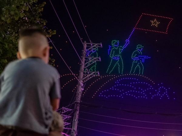 Tối 5/5, phía trên tượng đài chiến thắng ở thành phố Điện Biên Phủ, tỉnh Điện Biên xuất hiện nhiều hình ảnh khổng lồ được tạo từ hơn 700 trăm drone phát sáng.