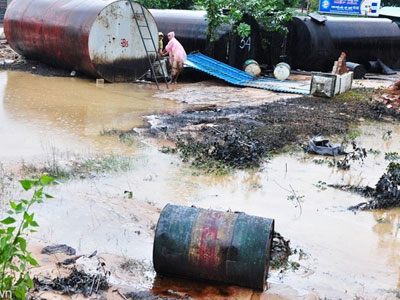 Lũ quét đột ngột tràn về gây vỡ hàng loạt thùng phuy chứa dầu nhớt và tràn vào nhiều nhà dân ở phường Bùi Thị Xuân (TP Quy Nhơn).