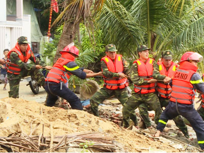 Gần 200 cán bộ, chiến sĩ cùng dân quân địa phương đã “dầm mình” trong nước lũ, trục vớt nhiều tàu cá và bè cá của ngư dân xã Tam Quang Bắc (huyện Hoài Hoài, Bình Định) bị lũ nhấn chìm.