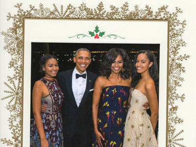 Tấm thiệp in hình cả gia đình Tổng thống Obama, được chụp tại một bữa tiệc tối trong tháng 3/2016 do Thủ tướng Canada chủ trì.
