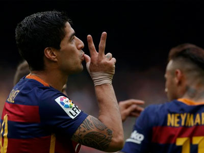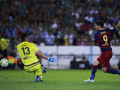 Luis Suarez vừa nâng khoảng cách lên bốn bàn so với Ronaldo khi lập công trong trận Barca thắng Betis ở vòng 36.