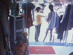 Người phụ nữ giả vờ xem quần áo phía bên ngoài để đánh lạc hướng chủ cửa hàng, trong khi đó đứa con trai lẻn vào shop quần áo để trộm điện thoại.