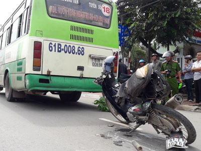 Chiếc xe buýt tông một thanh niên chạy xe máy chết tại chỗ. Thi thể nạn nhân nằm cách xe buýt 100m.