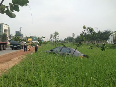 Chiếc xe ô tô biển đỏ đang lưu thông bất ngờ bị xe đầu kéo chạy phía sau lao lên tông trúng, hất văng chiếc xe này xuống vệ đường.