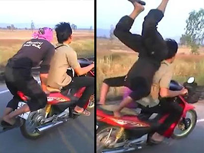 Hãi hùng thanh niên "trồng chuối" trên xe máy đang di chuyển tốc độ cao