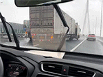 Nhiều chiếc xe container bj gió thổi lắc lư, thậm chí đã có chiếc bị lật khi cơn bão Bebinca bắt đầu tiến vào thành phố Tô Châu, tỉnh Giang Tô, Tung Quốc.