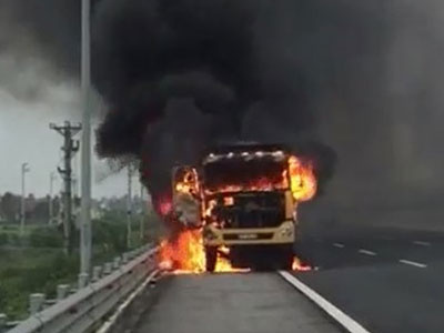Hiện trường ô tô 16 chỗ bốc cháy ngùn ngụt...