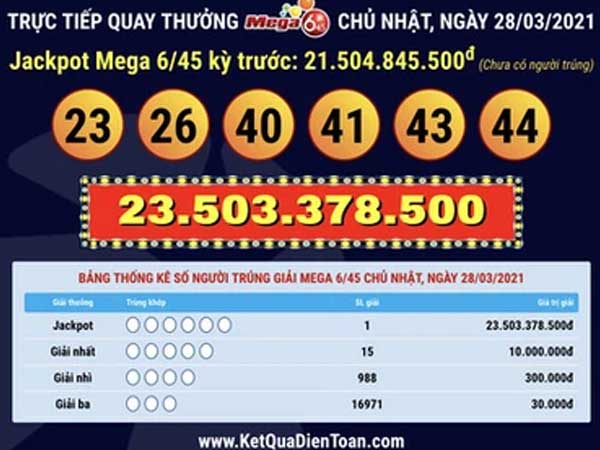 Giải độc đắc Jackpot trị giá gần 32 tỷ đồng của xổ số Vietlott loại hình Mega 6/45 tối nay đã tìm thấy chủ nhân may mắn trúng thưởng. Cách đây 3 hôm, Vietlott cũng xác định có khách hàng trúng giải trị giá hơn 47 tỷ đồng.