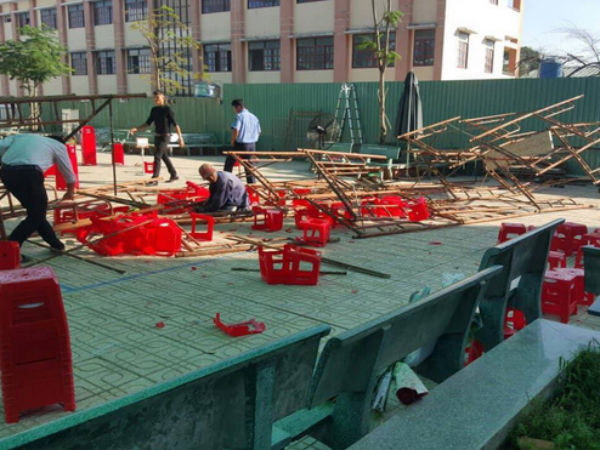 Theo cơ quan chức năng, sáng ngày 20/11 khi chuẩn bị làm lễ thì do gió lớn, cuốn tấm che nắng đẩy giàn giáo ngã đổ xuống sân khiến các học sinh bị thương.