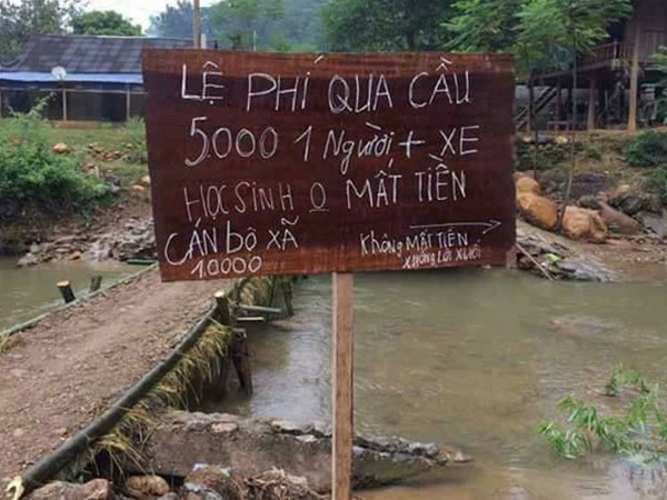 Sau khi dựng cây cầu tre tạm bợ bắc qua suối, người dân đã cắm biển thu phí với mức giá từ 5.000 - 10.000đ mỗi lượt đi qua.