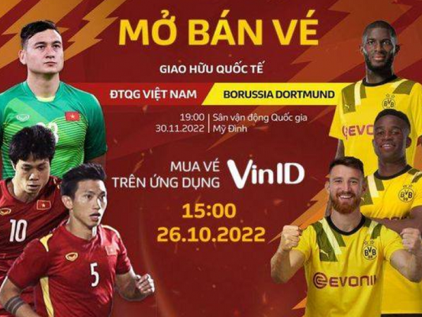 Trận giao hữu giữa ĐT Việt Nam vs Dortmund diễn ra vào tối 30/11 sẽ được bán trực tuyến thông qua ứng dụng VinID, từ 15h00 ngày 26/10 và kết thúc vào ngày 3/11, hoặc đến khi toàn bộ số vé được bán hết trước ngày 3/11.