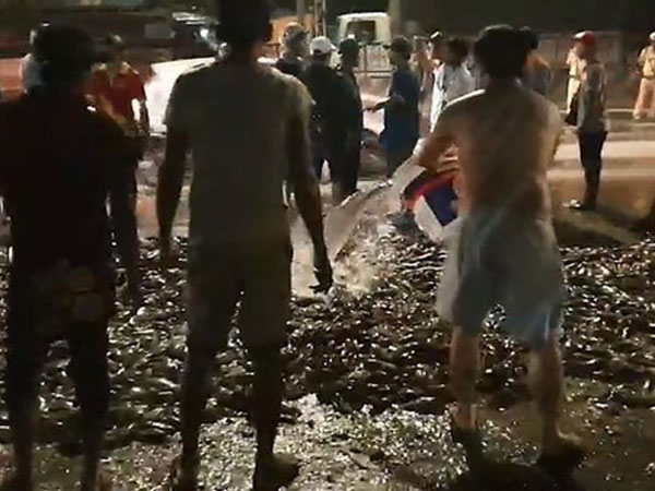 Xe tải lật ngang, gần 3 tấn cá rô bò lổn nhổn trên quốc lộ